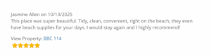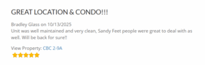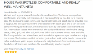 At Sandy Feet VR, we’re committed to cleanliness and the guest experience. Our professional cleaning teams are dedicated to upholding the highest standards of cleanliness, making every guest’s stay a memorable one. With over 1,200 glowing reviews highlighting cleanliness as a major factor in their positive experience, our guests trust us to provide a spotless vacation rental every time.