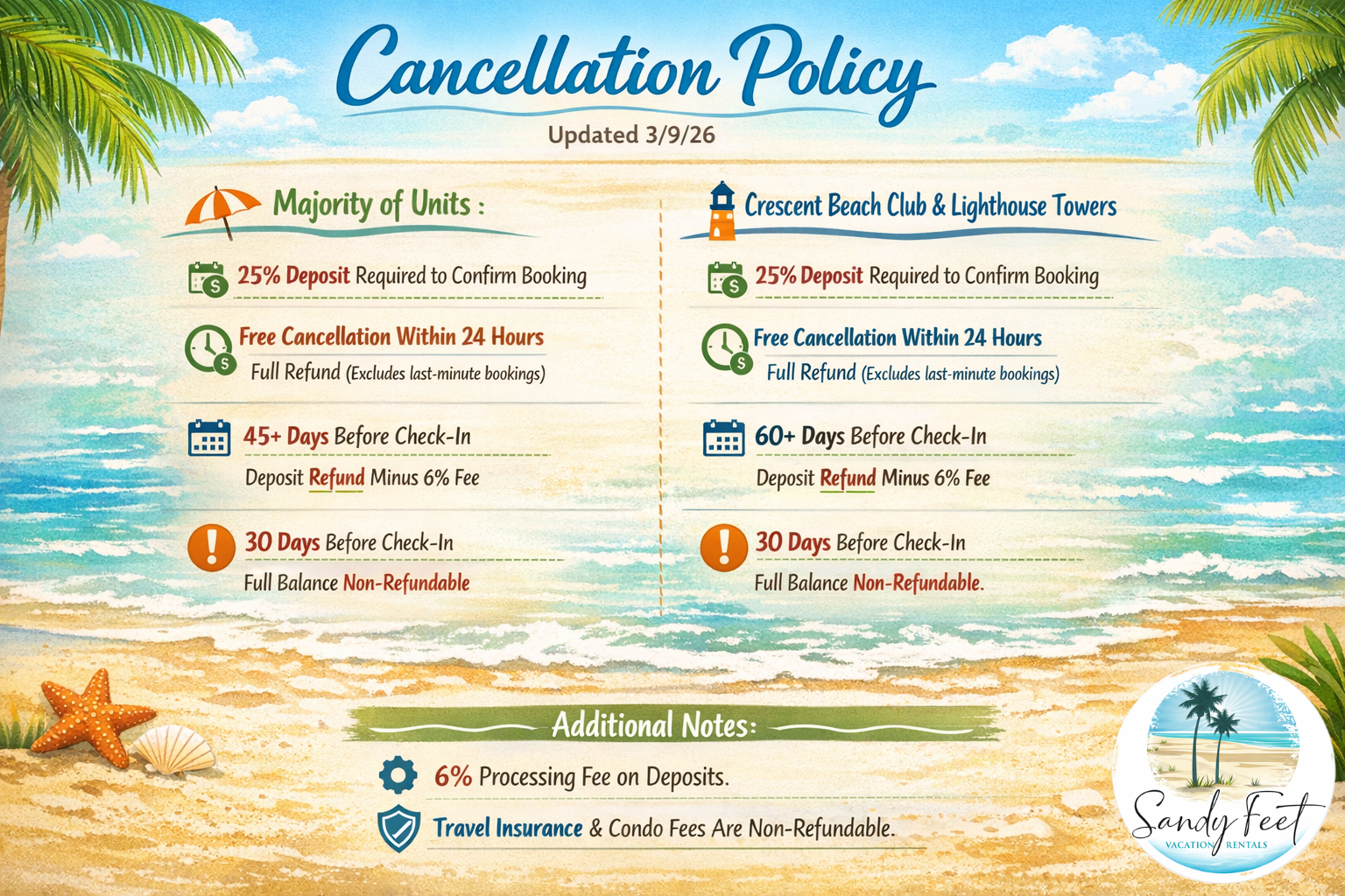 **Please note: Crescent Beach Club / Lighthouse Towers has their own cancellation policy**